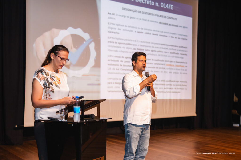 Durante o evento, foram apresentados os principais pontos do Decreto Municipal nº 014/E/2026, que regulamenta aspectos da execução contratual.