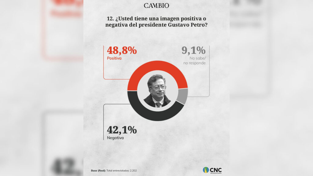 De acordo com a pesquisa, quando questionados sobre a imagem do presidente, 48,8% dos entrevistados afirmaram ter uma percepção positiva de Gustavo Petro, enquanto 42,1% declararam ter uma imagem negativa. Outros 9,1% disseram não saber ou preferiram não responder. O levantamento foi realizado com 2.202 pessoas, em 56 municípios distribuídos por todas as regiões do país, incluindo Caribe, Bogotá, Centro-Leste, Centro-Sul-Amazonas, Eixo do Café, Llanos e Pacífico. A margem de erro é de 2,9%, com nível de confiança de 95%.