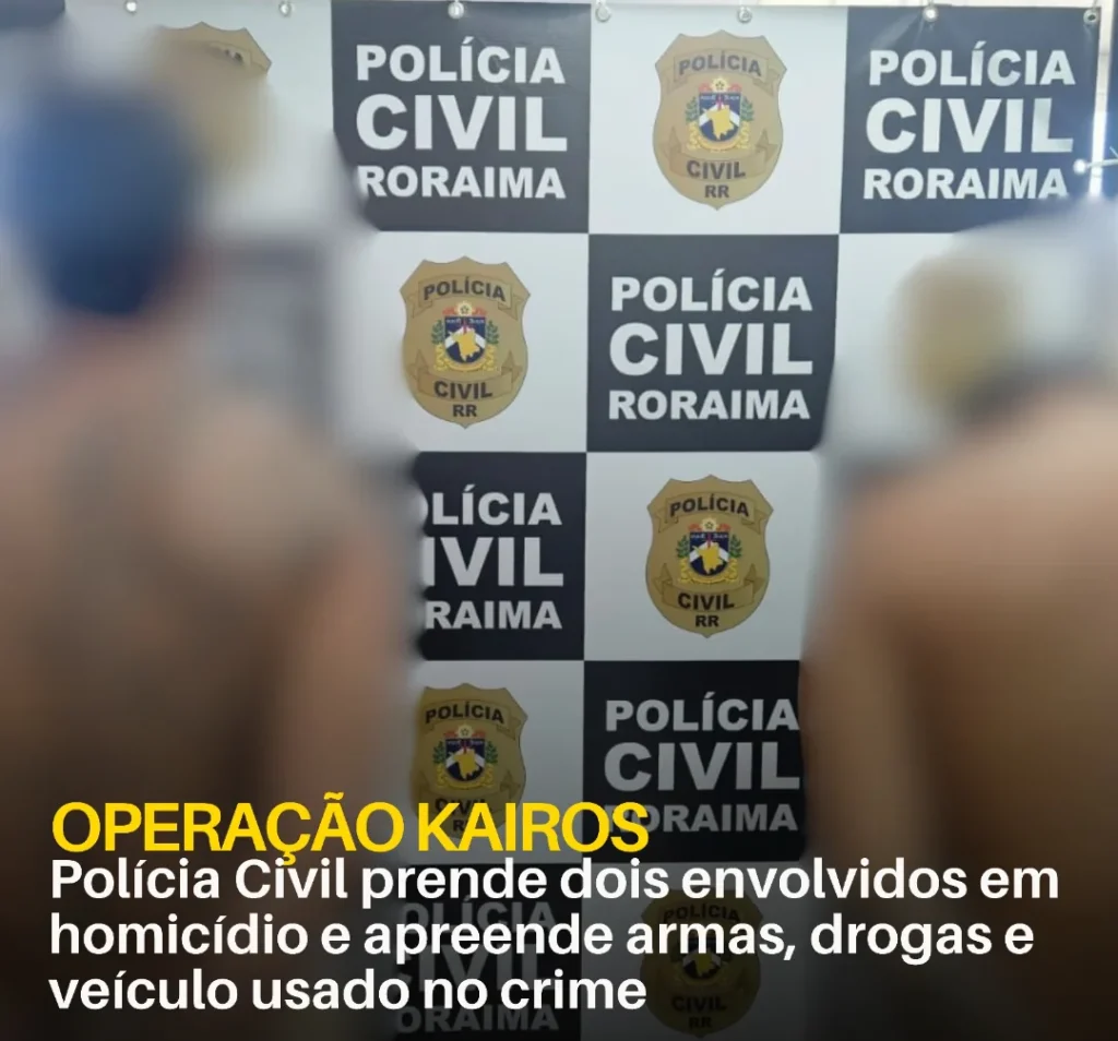 A PCRR (Polícia Civil de Roraima) deflagrou, nesta terça-feira, dia 18, a Operação Kairós, que resultou na prisão em flagrante de dois integrantes de uma facção criminosa envolvidos no homicídio ocorrido no fim da tarde de segunda-feira, dia 17, no bairro Nova Canaã, que teve como vítima o albergado Weslee de Almeida Veras, de 32 anos. A ação foi coordenada pelo 3º DP, com apoio do N.I (Núcleo de Inteligência), GRT (Grupo de Resposta Tática), DRRFVAT (Delegacia de Repressão a Roubos e Furtos de Veículos Automotores Terrestres) e da DGH (Delegacia Geral de Homicídios).
